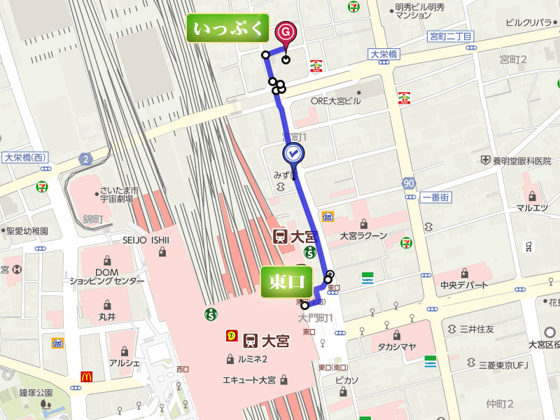 1、JR大宮駅東口を下車。大通りを左手に向かいます。ドンキを通り過ぎて真っ直ぐ進みます。